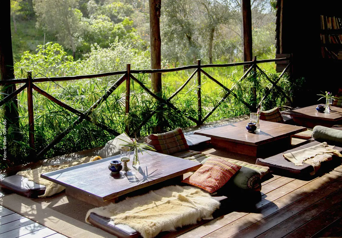 The large tents, yurts and tipis stand on platforms in the middle of the valley. Francisco made all the wooden constructions and thatched roofs, as well as the large open-air pavilion, together with local craftsmen. All materials come from the region. Francisco and Claudia brought most of the tents, such as beds, bedside tables, chairs and mirrors, from their numerous trips to India, Vietnam, Thailand and Morocco. They also made sure that the furniture came from local and sustainable production.