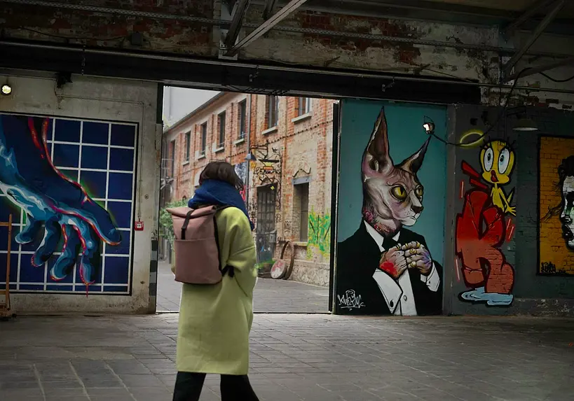 Den Industriecharme der hohen, lichten Räume haben die Betreiber erhalten. Ein perfekter Ausgangspunkt, um das knapp sechs Hektar große Spinnereigelände zu erkunden, das heute ein Kreativquartier mit Galerien, Werkstätten, Architekturbüros, Theater, Tonstudio ist.