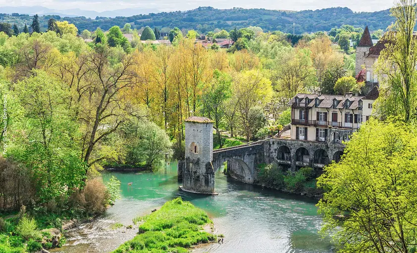 Auch in der Umgebung lässt sich die reiche Natur- und Kulturlandschaft entdecken, angefangen von der mächtigen 200 Jahre alte Platane direkt vor dem Schloss bis hin zu der majestätischen Gebirgskette der Pyrenäen. In Sichtweite grasen die friedlichen Blondes d'Aquitaine (blonde Kühe) auf der Weide und die kleine Kirche Saint Jaques läutet stündlich ihre Glocken. Der Jakobsweg "Voie de Vezelay" führt in knapp 300 Metern Entfernung am Haus vorbei. Als Ausflugsziel eignet sich außerdem das ganz besondere baskische Heimatmuseum "Chemins/Bideak" oder das Dörfchen "Sorde l'Abbaye", das zum Weltkulturerbe erklärt wurde. Dies sind nur einige der bedeutenden Stätten, die es zu besuchen lohnt. In der näheren Umgebung gibt es zudem vielfältigste Wellness- und Bade-Möglichkeiten. Auch das Meer ist nur eine knappe Stunde mit dem Auto entfernt, genauso wie die majestätischen Pyrenäen.
