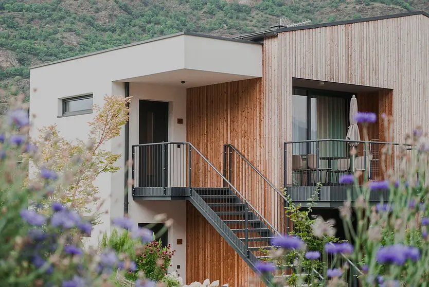 Die hellen, großzügigen Räume geben durch die teils großen Fensterfronten den Blick frei auf Schloss Juval, den Naturnser Sonnen- und den Nörderberg. Die Natur umgibt die Lodges, bestimmt aber auch das Raumkonzept im Inneren: Das naturbelassene Holz und die Decken aus Lehmbauplatten schaffen eine wohltuende, wärmende Atmosphäre wobei der zeitlos elegante Stil auf maßgefertigte Möbel trifft. Eichenholzparkett und Loden sowie die dezenten, natürliche Farben verleihen dem Wunsch Ausdruck, Stil und Wohnkomfort zu vereinen.