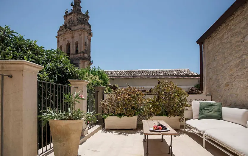 Die Villa ist direkt neben einem der Wahrzeichen der Stadt Modica gebaut: der barocken Kathedrale San Giorgio. Deren beeindruckendes Profil ist auch das erste, was die Gäste beim Blick aus dem Fenster sehen. Wer nicht vom sanften Klang der Glocken geweckt wird, begibt sich spätestens beim Duft des mediterranen Frühstücks aus dem Bett.
