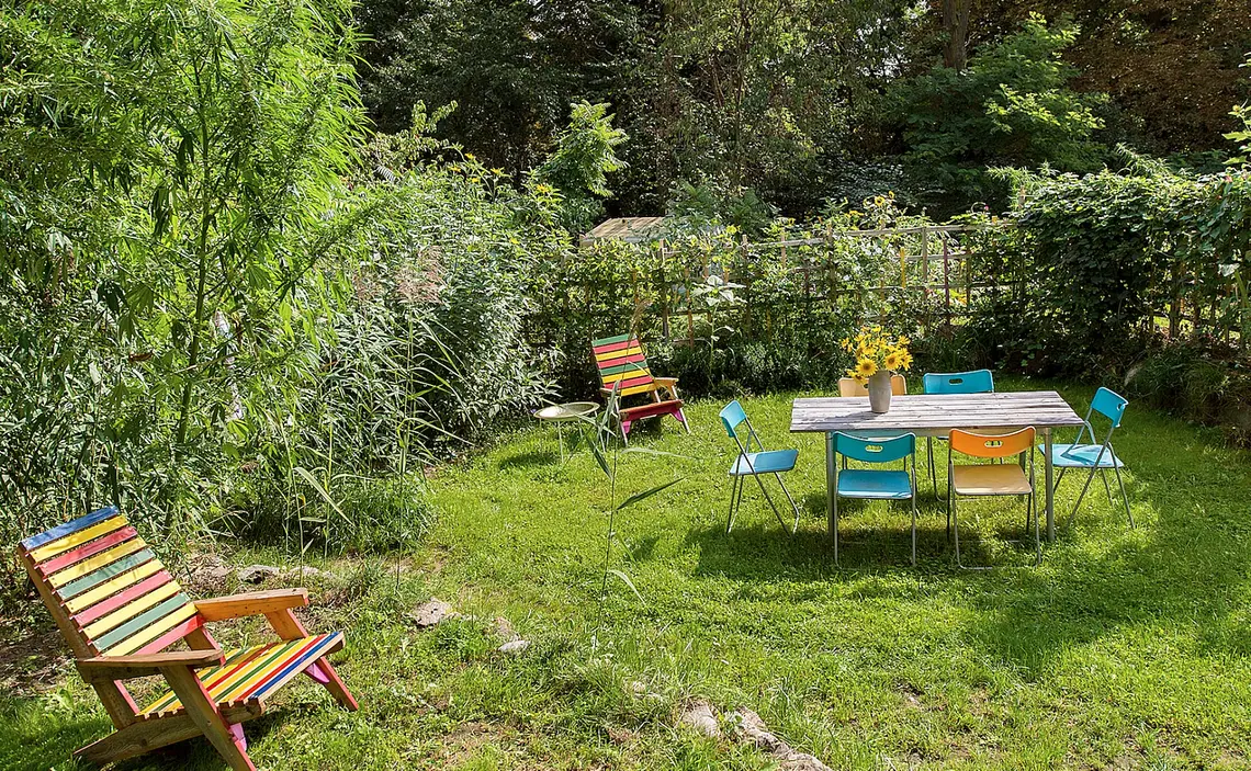 Und inspirierenden Austausch mit Gleichgesinnten bei gemütlichen Grillabenden. Außenrum üppige Natur mit Wald und Wasser und viel freiem Himmel darüber zum Radeln, Spazieren, Baden und Genießen. Ganz besonders gelungen sind die Holzhäuschen zum Übernachten im Garten - ein ganz naturverbundenes Erlebnis!
