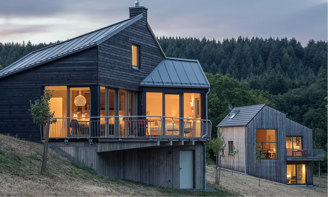 Es sollte ein möglichst geringer Flächenverbrauch für die Häuser entstehen, weshalb zwei kleinere Häuser entstanden sind. Der Holzbau besteht aus recycelbarem Baumaterial und wurde mit lokalen Anbietern und bevorzugt regionalen Materialien umgesetzt. Das Vulkaneifelhaus liegt an einem Südhang und ist als räumliche Modulation gebaut, die von Verengungen und Aufweitungen geprägt ist, und somit intime und sich öffnende Räume umfasst. Alle Bereiche sind einzigartig in ihrer Atmosphäre und ihren Ausblicken durch große Fenster auf die umliegende Natur. Das kleine Vulkaneifelhaus beschreibt der Gastgeber als Versteck, das einen Rückzugsort von der Außenwelt bietet und gleichzeitig eine wunderbare Aussicht auf das Tal ermöglicht. Das Haus hat eine polygonale Grundfläche und wird von einem Satteldach überspannt — je nachdem, ob man sich auf Hang- oder Talseite befindet, wirkt das Gebäude unterschiedlich groß.